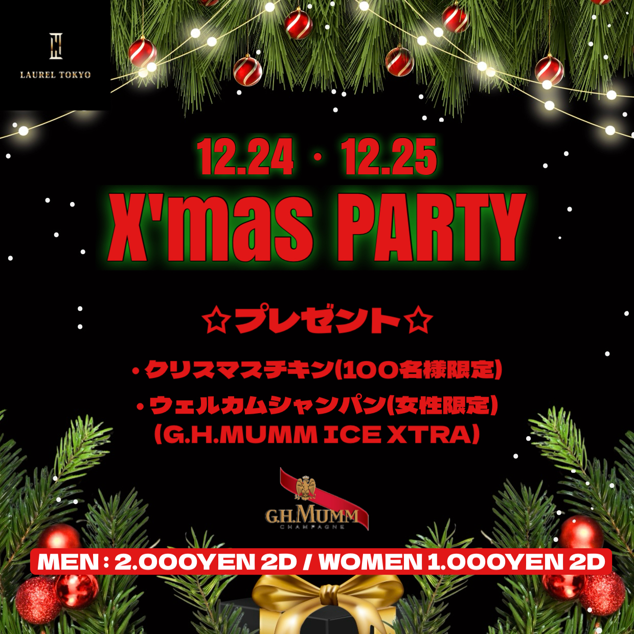 12月24日.12月25日開催日 ・クリスマスチキン(限定100名様) ・ウェルカムシャンパン(女性限定) をプレゼント!